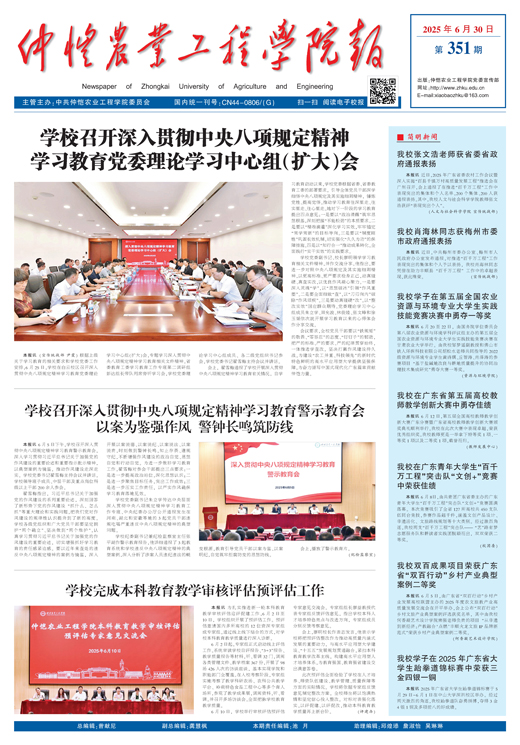本报讯(宣传统战部 尹霞) 根据上级关于学习教育的相关要求和学校党委工作安排,6月25日,学校在白云校区召开深入贯彻中央八项规定精神学习教育党委理论学习中心组(扩大)会,专题学习深入贯彻中央八项规定精神学习教育相关文件精神。省委教育工委学习...