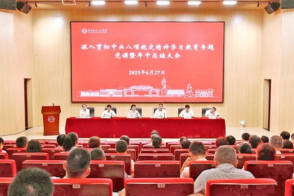 本报讯 为深入推进党的作风建设,全面回顾并总结上半年工作成效,同时规划部署下半年工作。6月27日,学校在白云校区德新楼报告厅召开深入贯彻中央八项规定精神学习教育专题党课暨年中总结大会。学校党委书记翟雪梅,党委副书记、校长廖明,党委副书记朱立...
