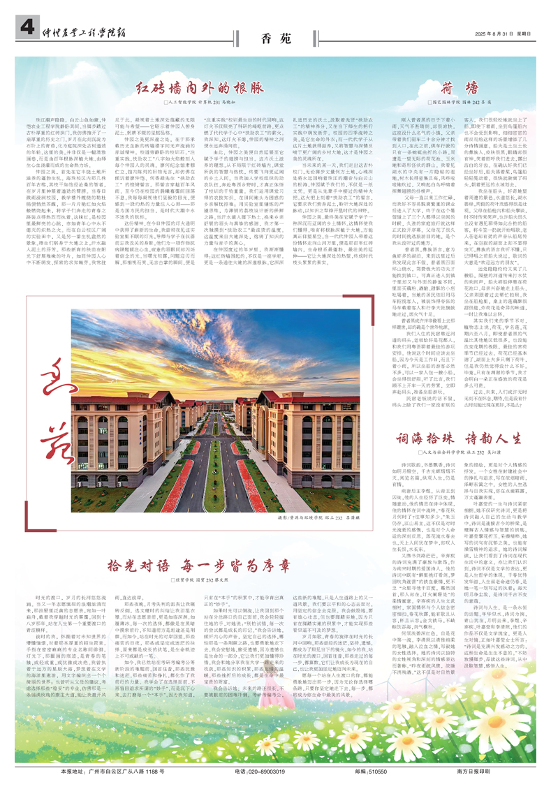 珠江潮声隐隐,白云山色如黛,仲恺农业工程学院静卧其间。当脚步踏过古朴厚重的红砖拱门,我仿佛推开了一扇厚重的历史之门。岁月在此刻沉淀为石阶上的青苔,化为庭院深处古树遒劲的年轮。这里的美,并非仅是一幅清雅画卷,而是由百年根脉深植大地、由师生心血...