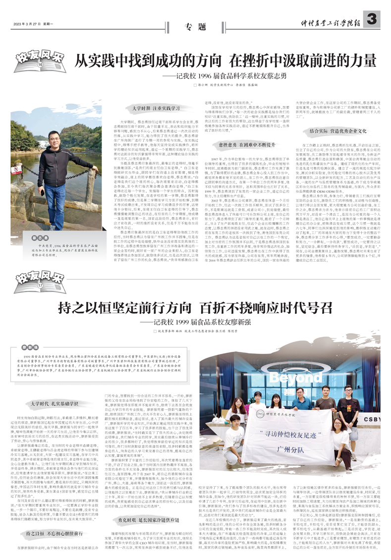 蔡志勇 中共党员,1996届食品科学系农产品储运与加工专业毕业生,现任广东碧茜生物科技有限公司总经理。大学时期 注重实践学习大学期间,蔡志勇担任过班干部和系学生会主席。蔡志勇刚担任班干部时,由于胆量不足、表达和组织能力不够等问题,感到力...
