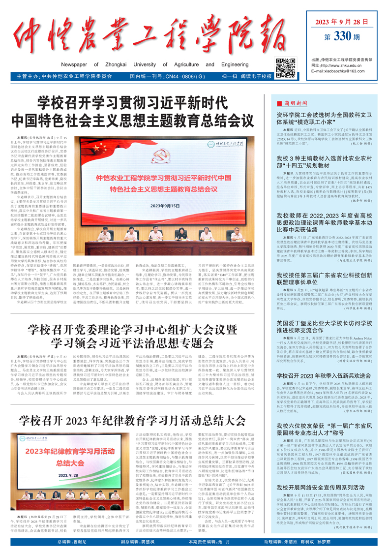 本报讯(纪检监察室)9月28日下午,学校召开2023年纪律教育学习月活动总结大会,学校党委书记宋垚臻作总结讲话。会议由党委副书记、校长廖明主持。学校领导、全体中层干部参加。宋垚臻在总结讲话中充分肯定了学校各基层党组织开展纪律教育学习月活动取...