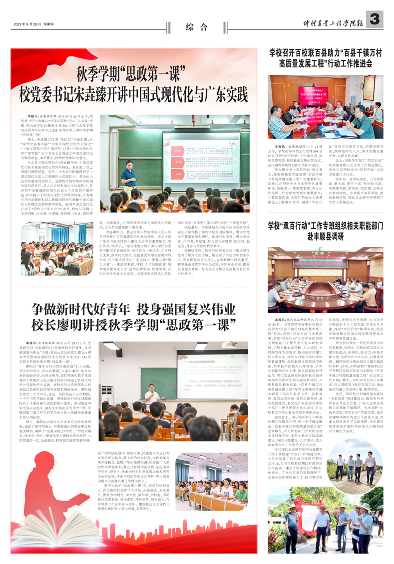 本报讯(宣传统战部 池月)9月28日上午,党委副书记、校长廖明以“争做新时代好青年,投身强国复兴伟业”为题,在白云校区经管大楼204课室为经贸学院国际经济与贸易专业231-233班的同学开讲秋季学期“思政第一课”。 廖明以“青年与时代的内在...