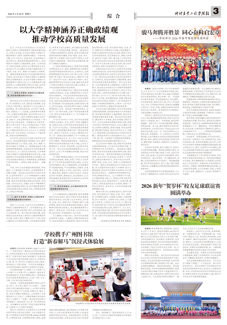 本报讯(学生工作部) 丙午马年新春将至,2月12日下午,在马年新春佳节来临之际,学校在海珠校区北区舞厅举办2026年寒假留校学生新春团拜会,师生欢聚一堂,一同迎接祥马新年的到来。学校党委副书记、校长廖明,学校党委常委、副校长徐玉娟,学生工作...