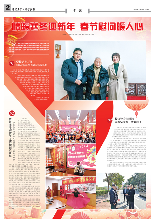 为深入学习贯彻习近平新时代中国特色社会主义思想和党的二十大精神,让党员、干部和师生深切感受到以习近平同志为核心的党中央的关怀和温暖,学校在甲辰龙年新春佳节前后开展了一系列走访慰问活动,让党员、干部和师生深切感受到学校党委的关怀和温暖。学校党...
