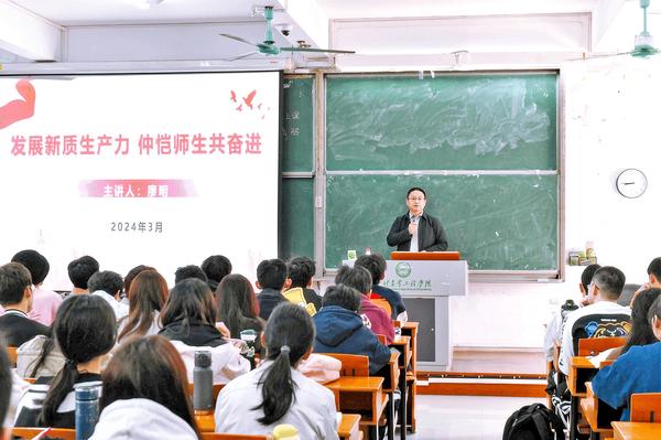 本报讯(宣传统战部 池月) 3月12日上午,党委副书记、校长廖 明以“发展新质生产力 仲恺师生共奋进”为题,在白云校区杨钊杨勋楼210课室为数学与数据科学学院信计231-233班和管理学院市营231-233班的同学们开讲2024年春季学期“思政第一课”。