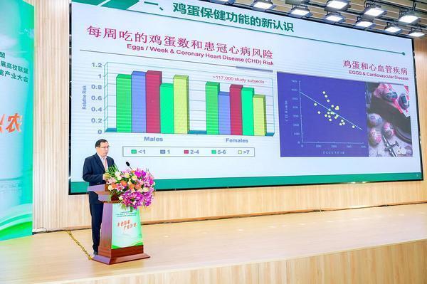 田亚东教授在大会上介绍了“鸡蛋的保健功能和特色蛋鸡育种”的研究成果。他运用国内外优良品种资源,结合育种技术,成功聚合了优异基因,创制外貌体型符合区域市场需求、生产性能高、肉蛋品质好的新种质。