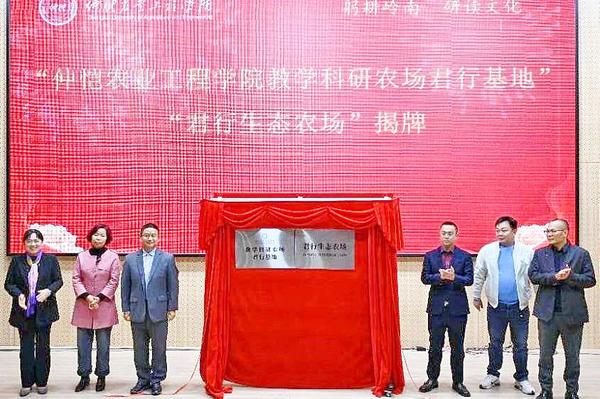 廖明与君行集团公司董事长张逢举共同为学校教学科研农场君行基地以及君行生态农场揭牌。