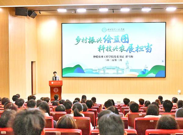 本报讯 3月18日上午,党委书记翟雪梅以“乡村振兴绘蓝图 科技兴农展担当”为题,在白云校区德新楼学术报告厅为管理学院和自动化学院学子讲授了一堂主题鲜明、内涵丰富的“思政第一课”。相关职能部门和二级学院负责人、思政课教师代表、辅导员代表等现场聆听了此次报告。